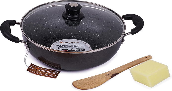- Mumma's LIFE Non-Stick Deep Kadai with Glass Lid- with Riveted and Virgin Bakelite Handle PFOA/Heavy Metal Free