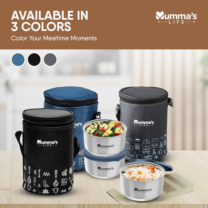 Mumma's LIFE- Stainless Steel Lunch Box Set of 2 (330 ml Each) with Insulated Lunch Bag, Leak Proof Lunch Box for Office & College (Grey)